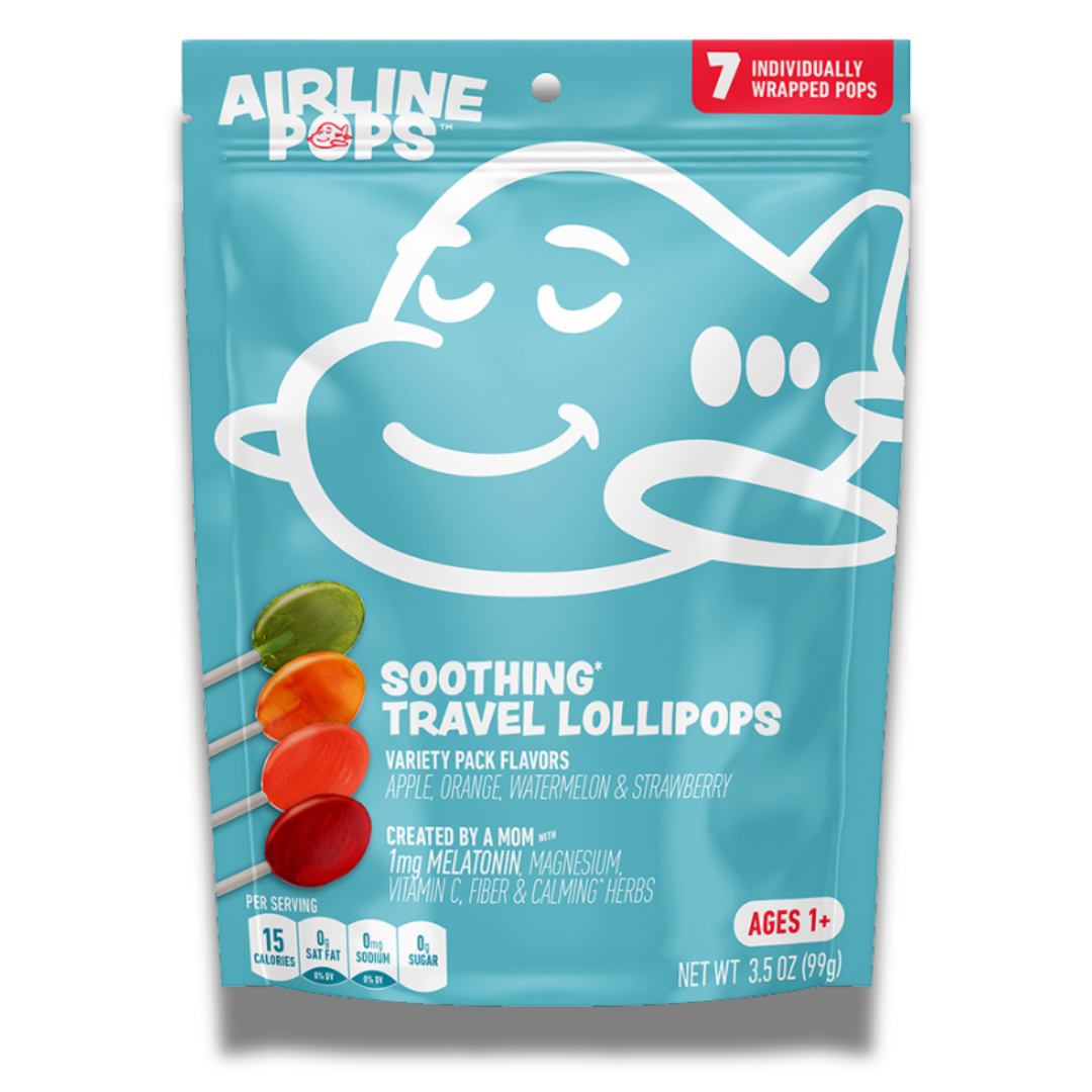 AIRLINEPOPS™ are delicious, sugar-free lollipops formulated to help kids fly easier. Made with magnesium, vitamin C, fiber, and calming botanicals like basil (high in antioxidants, which helps prevent inner ear damage) and ginger (has anti-inflammatory properties that helps reduce swelling), they support pressure relief and promote calm—naturally.